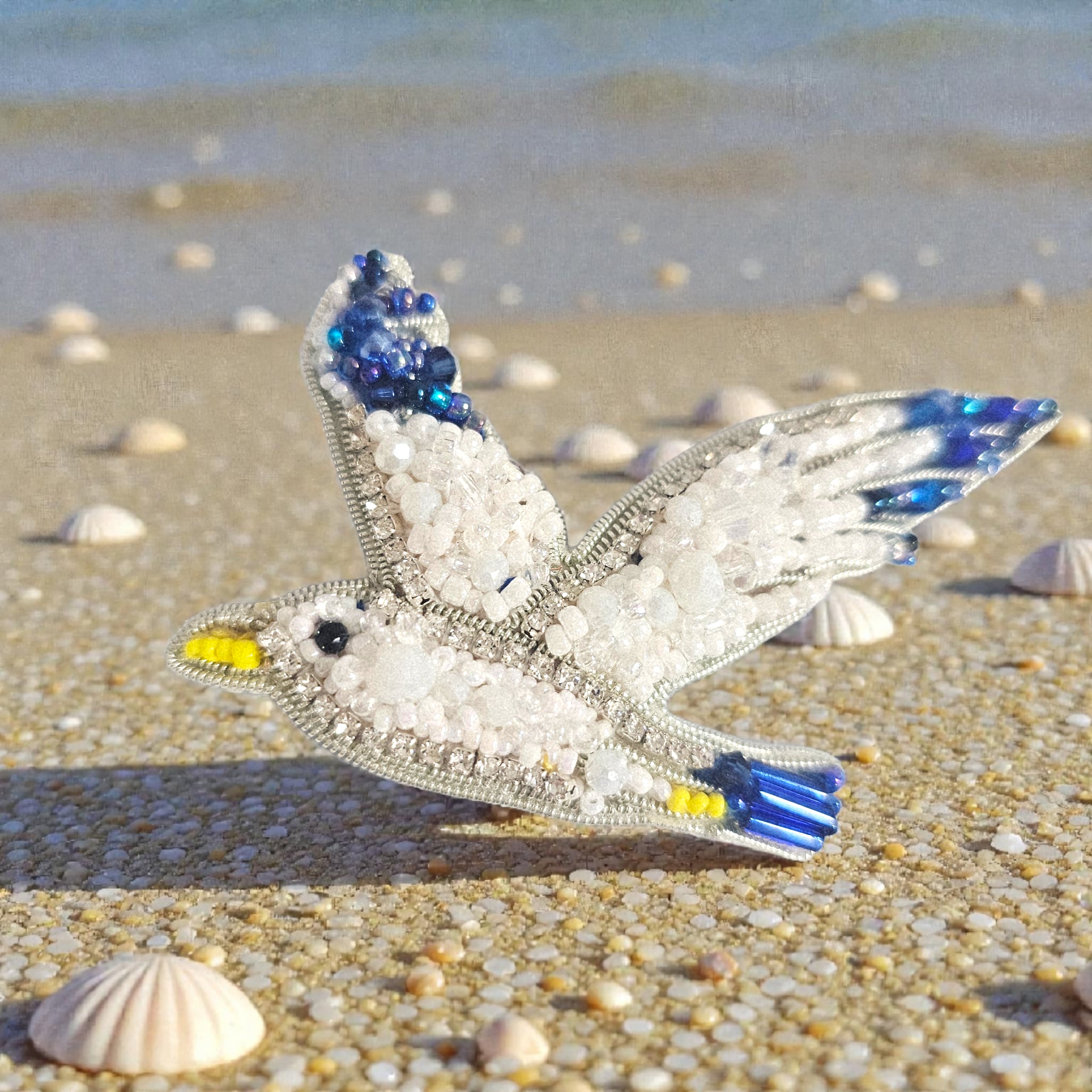 カモメをモチーフにしたブローチを一針ずつ丁寧に作り上げました。身につけることで、あなたの日常にさわやかな風を運んでくれます。