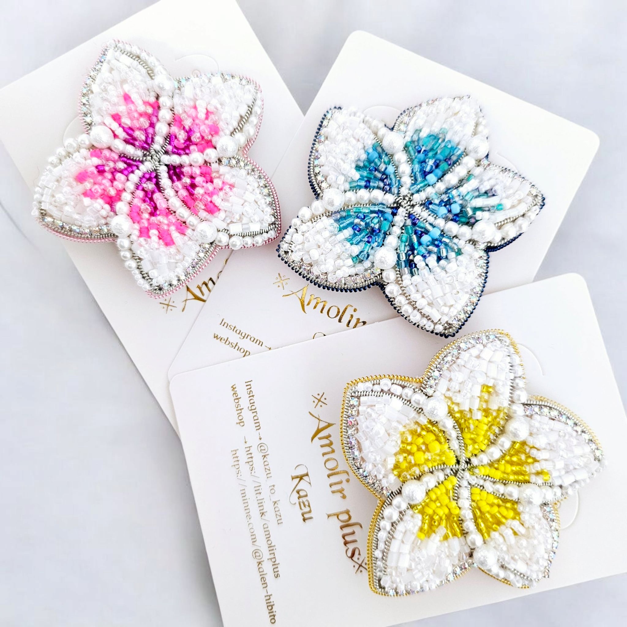 ワイヤーで輪郭をとり、ガラスビーズとスワロフスキークリスタルを贅沢に使用しています。立体感と奥行きがあり、花の細やかな表情や輝きを楽しめます♡