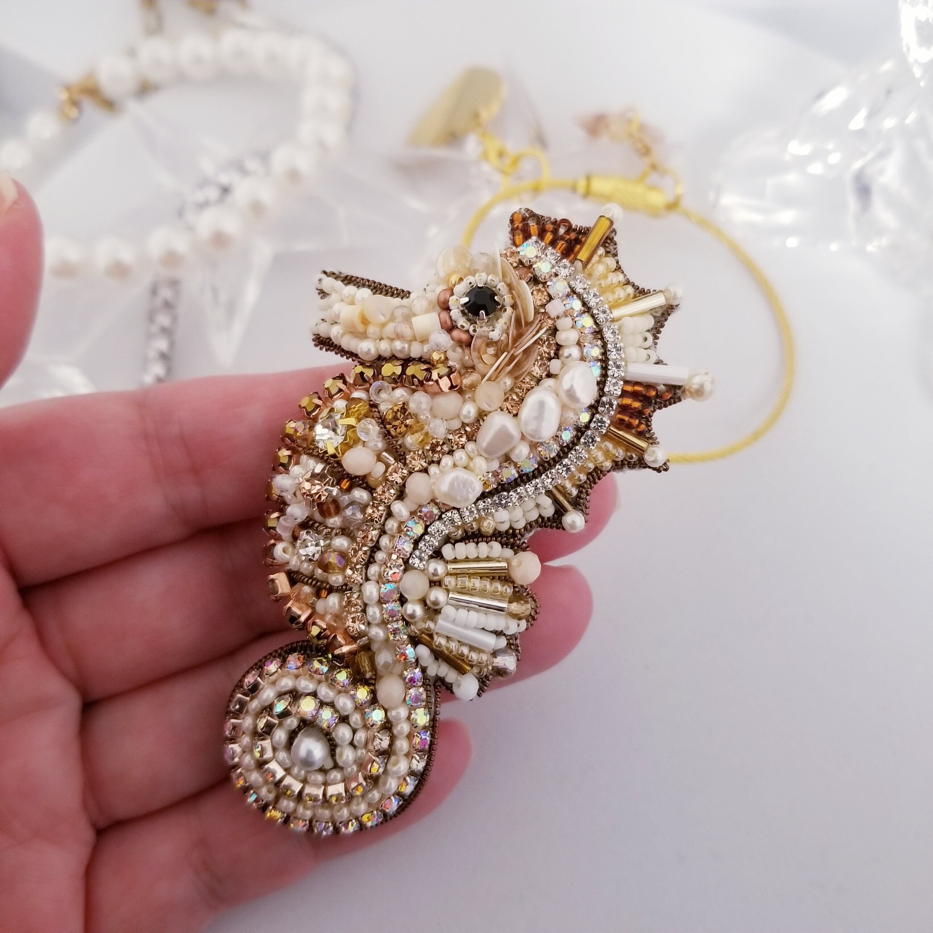 タツノオトシゴ エクリュ(luckycharm) ビーズ刺繍 bagcharm & brooch (2way)