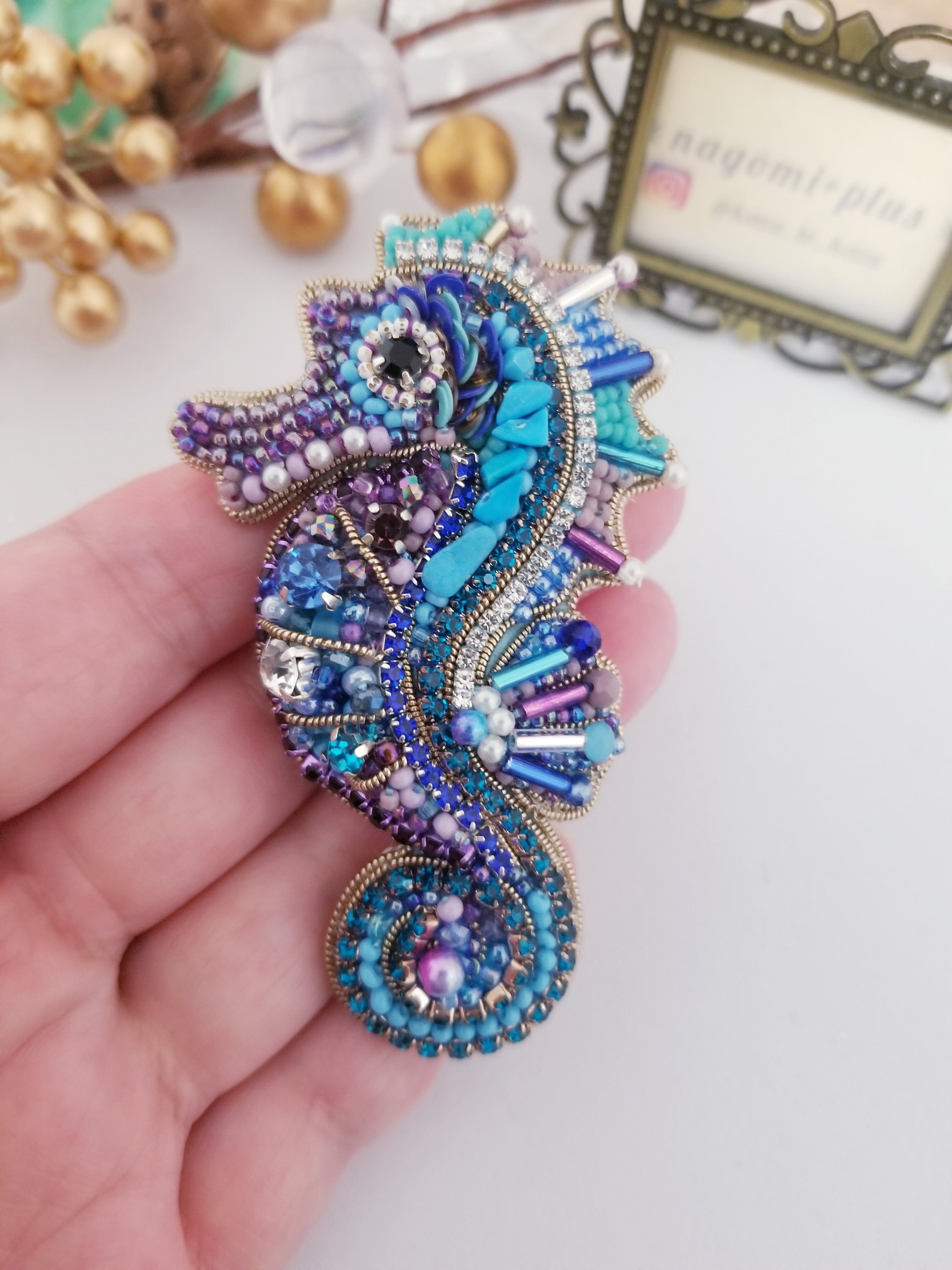 タツノオトシゴ ターコイズブルー(luckycharm) ビーズ刺繍 bagcharm & brooch (2way)