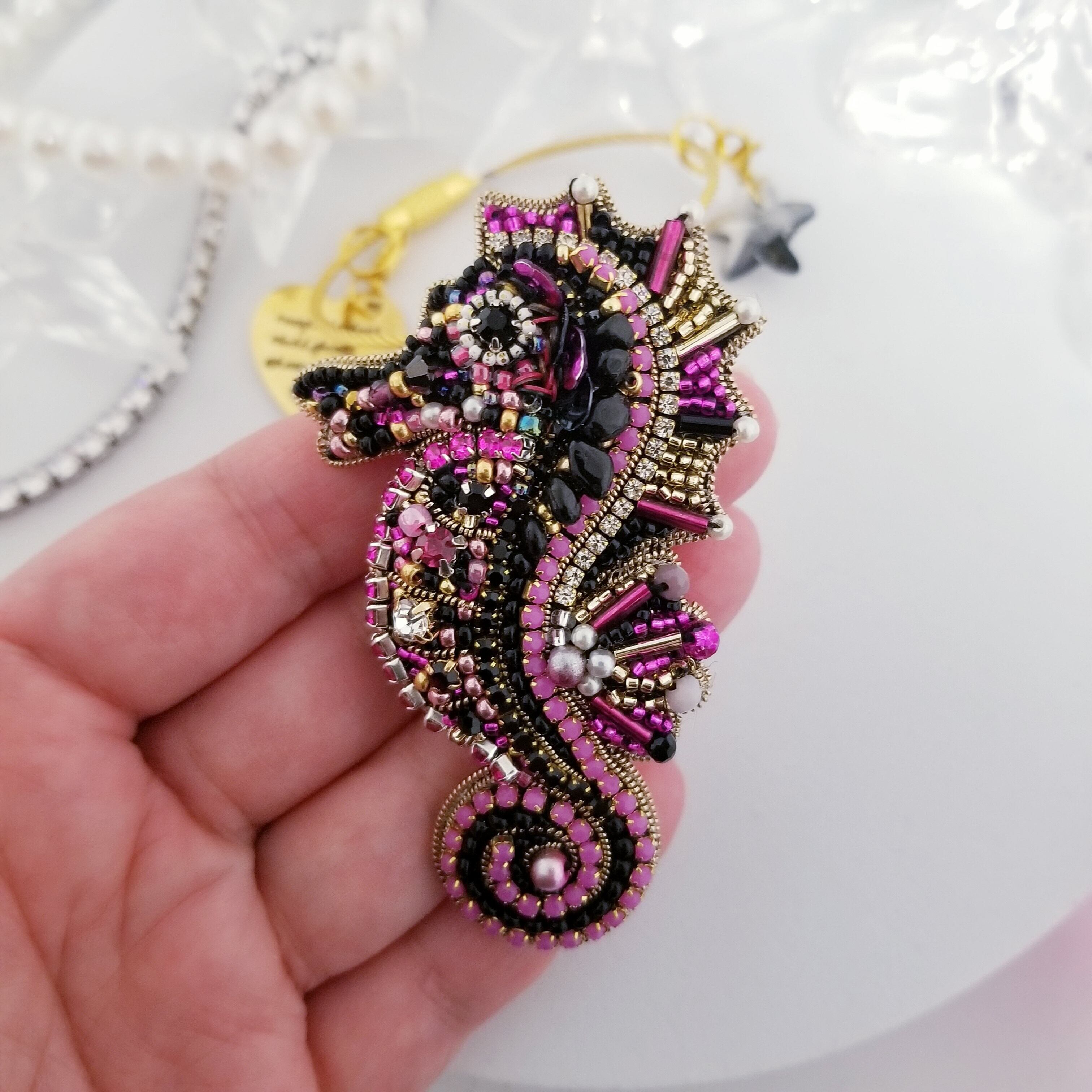 タツノオトシゴ オニキス (luckycharm) ビーズ刺繍 bagcharm & brooch (2way)